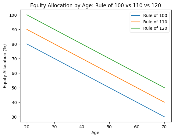 A comparison of Rule of 100 vs Rule of 110 vs Rule of 120 is shown in the chart below: